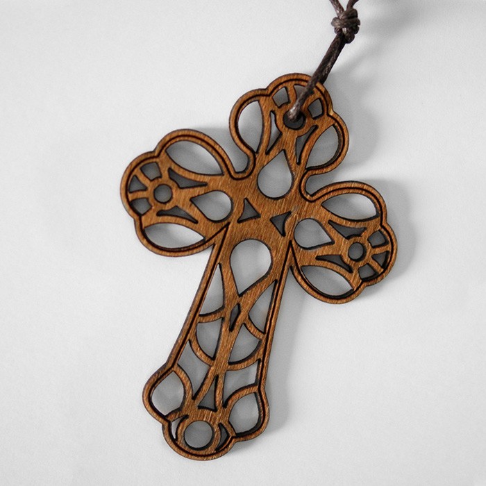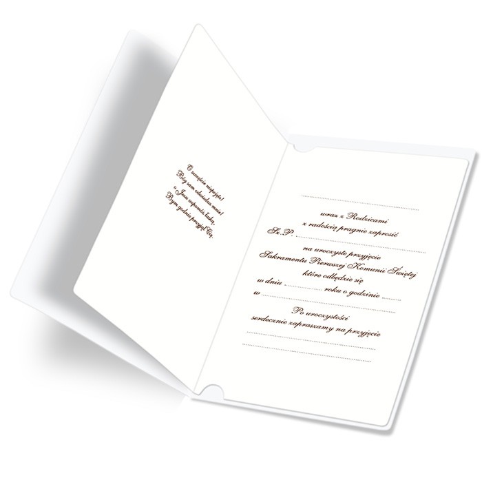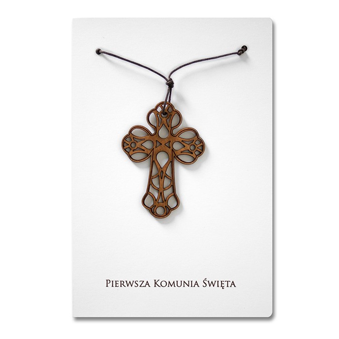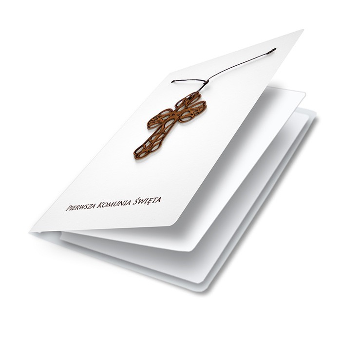 Zaproszenie na Komunię Świętą wykonane z matowego papieru w kolorze białym. Na okładce znajduje się drewniany krzyż zawieszony na brązowym rzemyku. Pod krzyżem nadrukowany został napis „Pierwsza Komunia Święta”. Wkładka do nadruku matowa w kolorze białym.