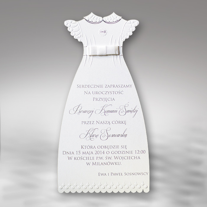 Zaproszenie na Komunię Świętą wykonane z matowego papieru w kolorze ecru. Na okładce znajduje się drewniana aplikacja w postaci krzyża. Pod krzyżem nadrukowany został napis „Pierwsza Komunia Święta”. Wkładka do nadruku matowa w kolorze ecru.