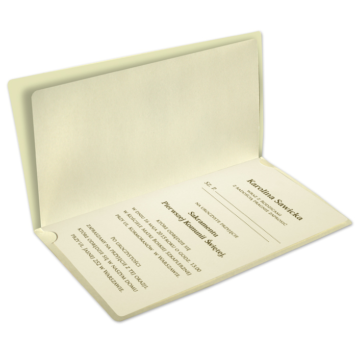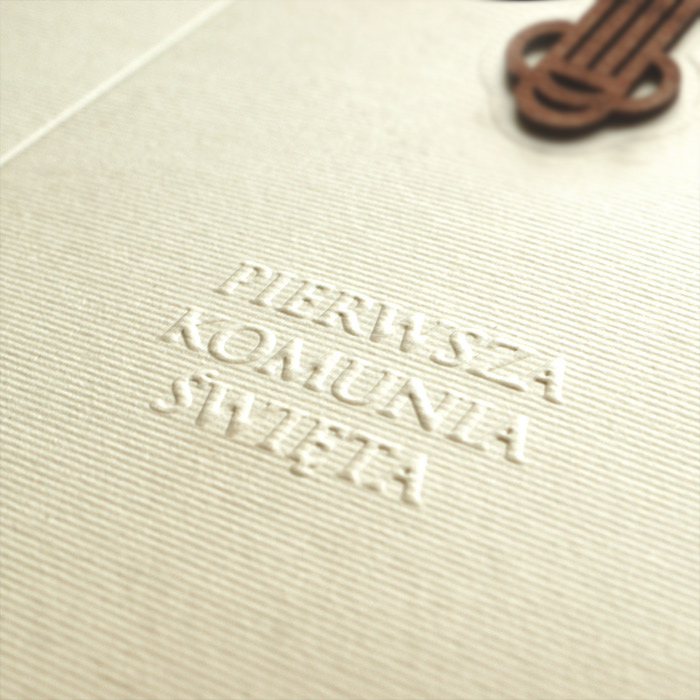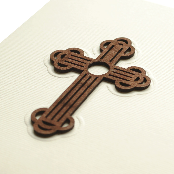 Zaproszenie na Komunię Świętą wykonane z matowego, delikatnie fakturowanego papieru w kolorze ecru. Na okładce znajduje się drewniana aplikacja w postaci krzyża. Pod krzyżem wytłoczony napis „Pierwsza Komunia Święta”. Wkładka do nadruku matowa w kolorze ecru.