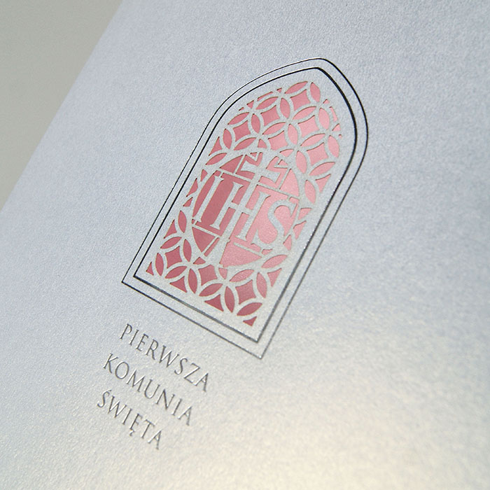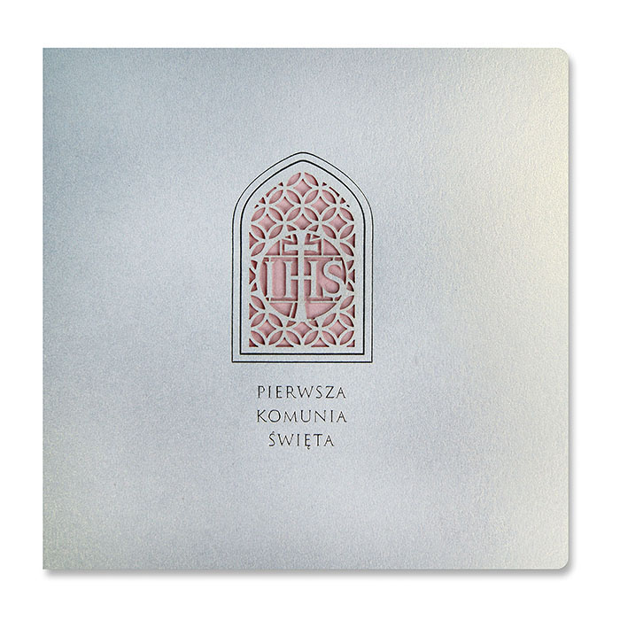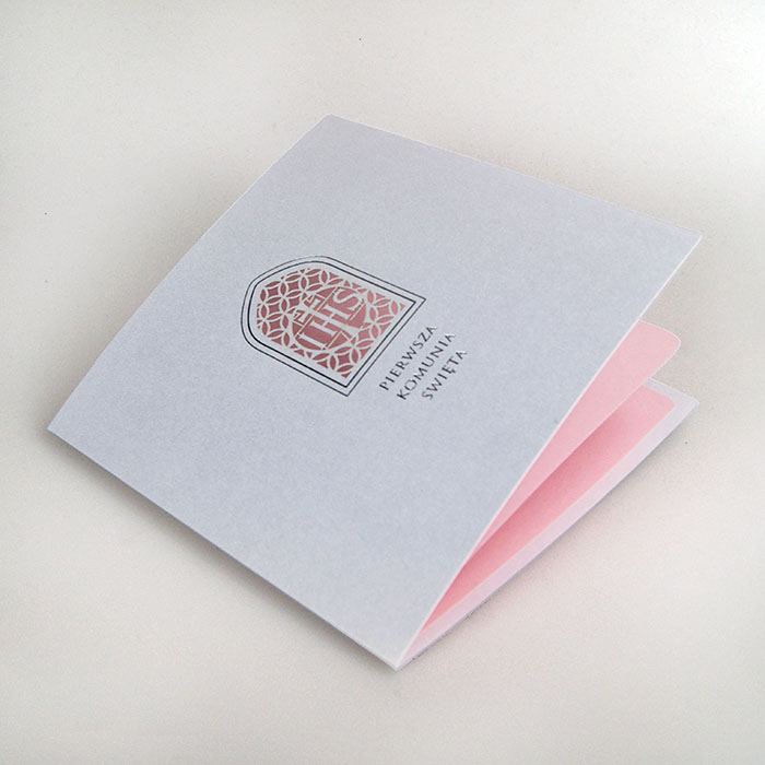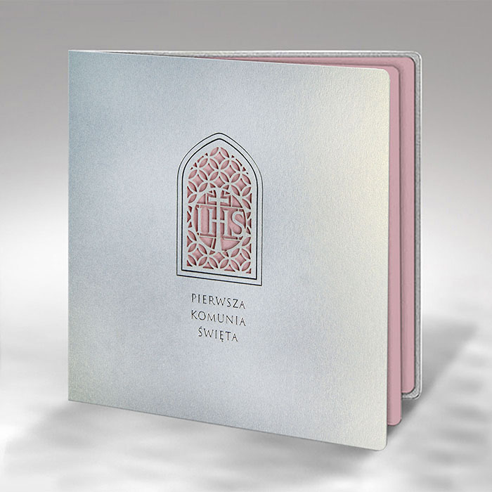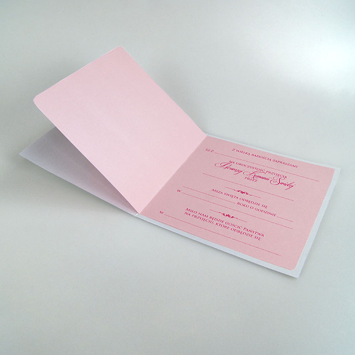 Zaproszenie na Komunię Świętą wykonane z perłowego papieru w kolorze białym. Na okładce znajduje się wycięty laserowo i wysrebrzony ozdobny ornament. Wkładka do nadruku różowa metalizowana. Minimalna ilość zamawianych zaproszeń wynosi 15 szt.