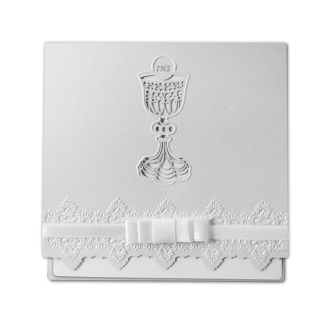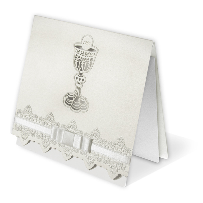 Zaproszenie na Komunię Świętą wykonane z perłowego papieru w kolorze białym. Na okładce znajduje się wycięty laserowo kielich z hostią. Ich kontury dodatkowo wytłoczono. Dół okładki ozdabia tłoczony motyw kwiatowy oraz biała, atłasowa wstążka. Wkładka do nadruku w kolorze białym.