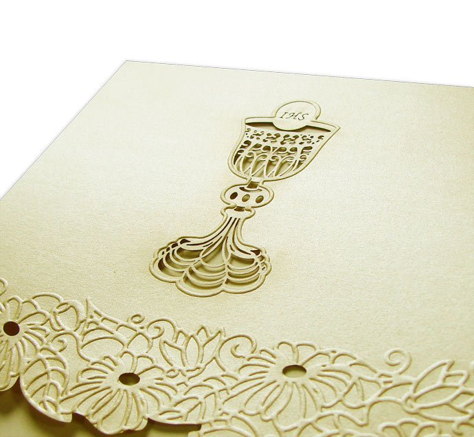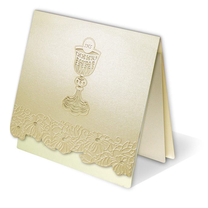 Zaproszenie na Komunię Świętą wykonane z perłowego papieru w kolorze ecru. Na okładce znajduje się wycięty laserowo kielich z hostią. Ich kontury dodatkowo wytłoczono.Dół okładki ozdabiają tłoczone kwiaty. Wkładka do nadruku w kolorze ecru.