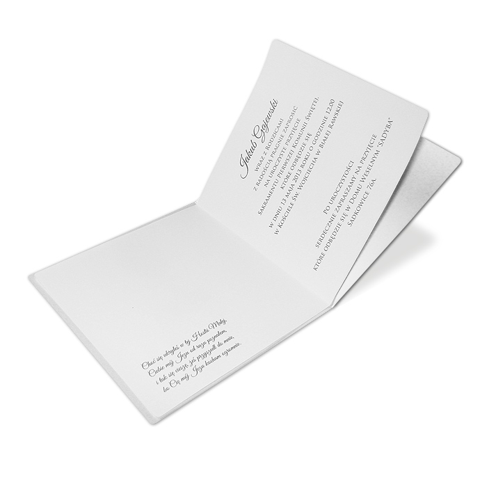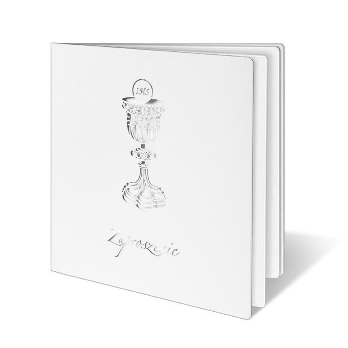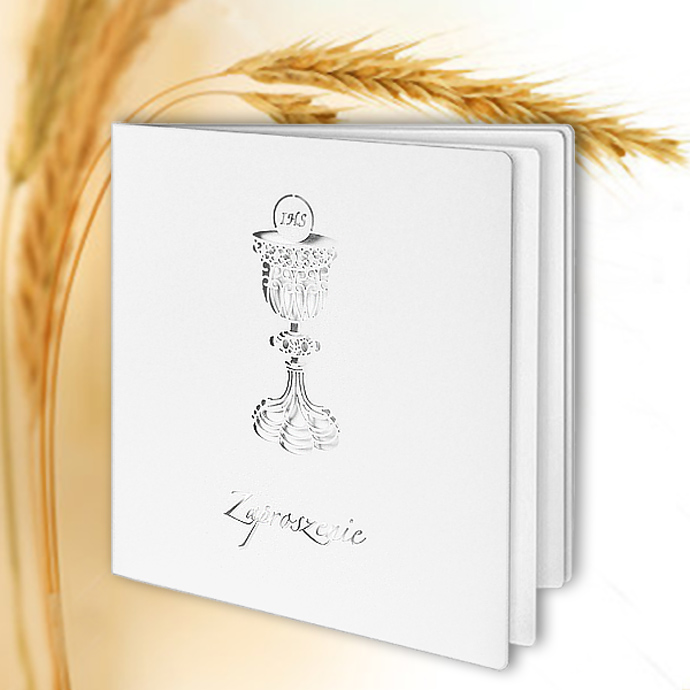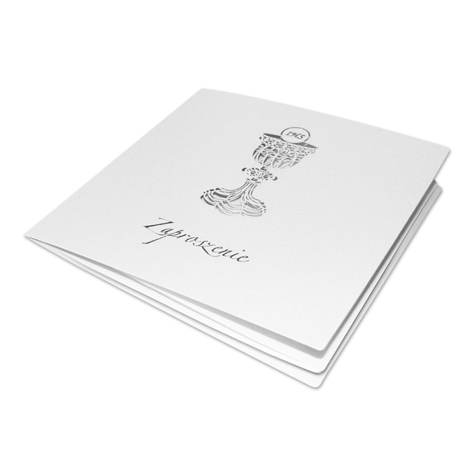 Zaproszenie na Komunię Świętą wykonane z perłowego papieru w kolorze białym. Na okładce znajduje się wycięty laserowo kielich z hostią. Pod kielichem wysrebrzony został napis „Zaproszenie”. Wkładka do nadruku matowa w kolorze białym.