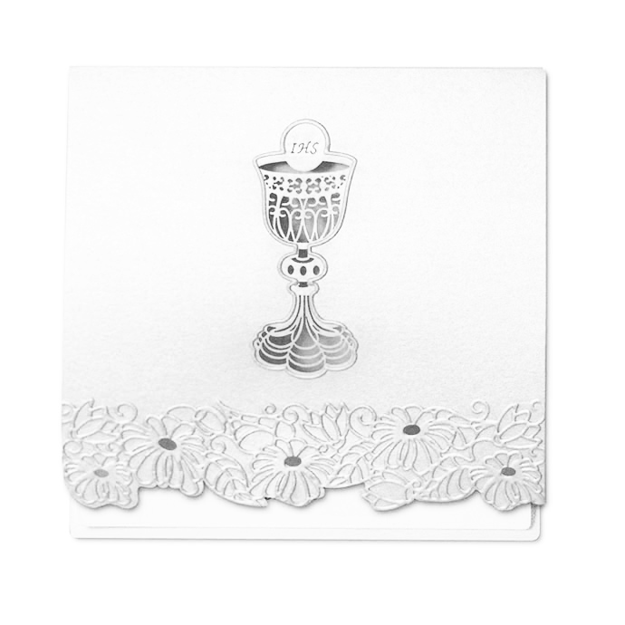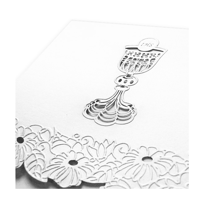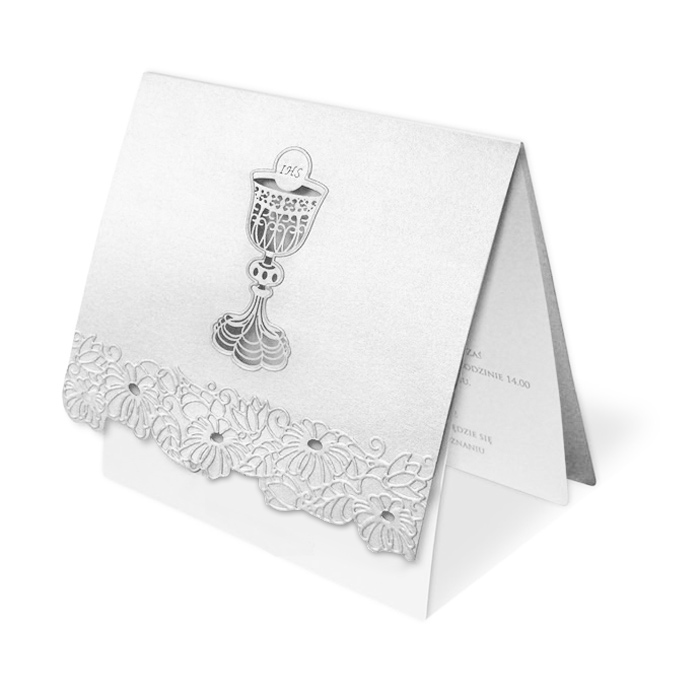 Zaproszenie na Komunię Świętą wykonane z perłowego papieru w kolorze białym. Na okładce znajduje się wycięty laserowo kielich z hostią. Ich kontury dodatkowo wytłoczono.Dół okładki ozdabiają tłoczone kwiaty. Wkładka do nadruku w kolorze białym.