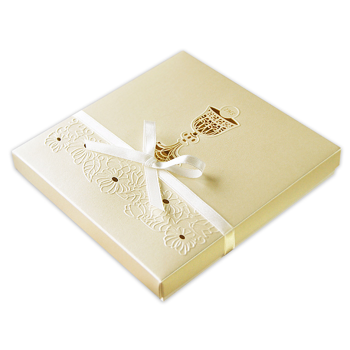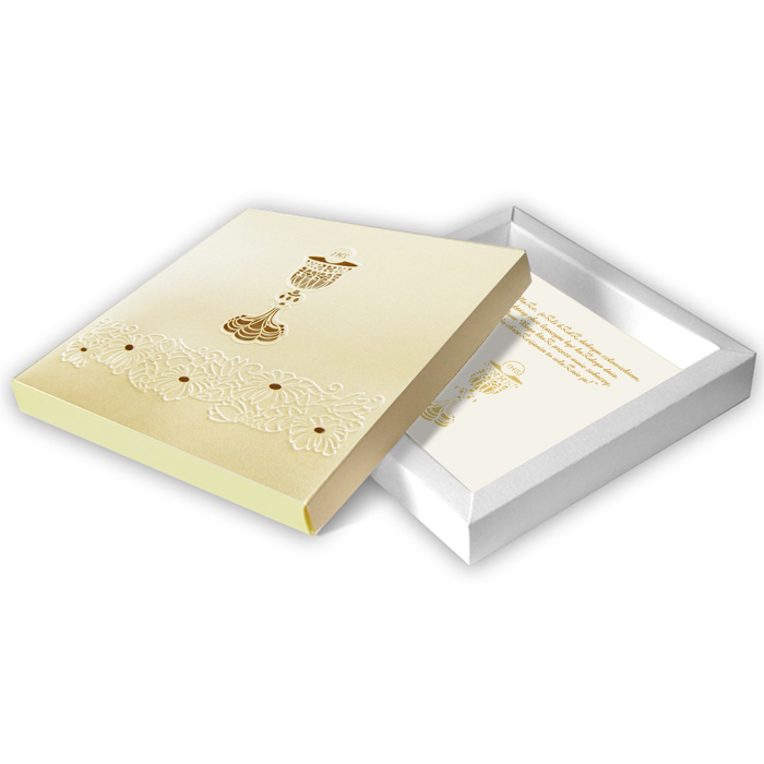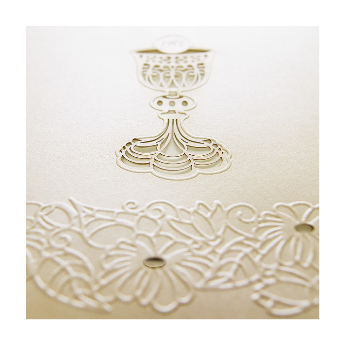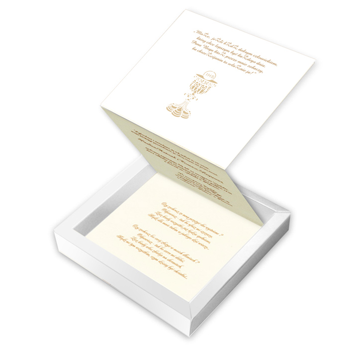 Eleganckie zaproszenie w formie pudełeczka. Wykonane z perłowego papieru w kolorze ecru. Spód – z białego matowego papieru. Na okładce znajduje się wycięty laserowo kielich z hostią. Ich kontury dodatkowo wytłoczono. Dół okładki ozdabiają tłoczone kwiaty. Całość przewiązana wstążką w kolorze ecru. Nadruk tekstu możliwy jest na wkładce w kolorze ecru składanej na 3. Zaproszenie wykonane z ogromną starannością i dbałością o detale. Precyzyjny nadruk, dokładność wykonania oraz wysokiej jakości papier.