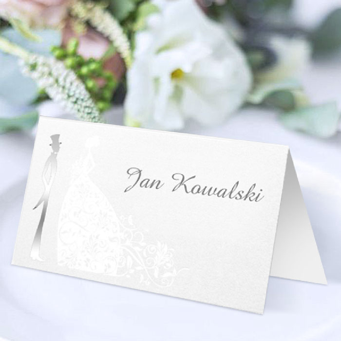 Winietka na stół z najnowszej kolekcji wykonana z perłowego papieru w kolorze ecru. Dół winietki wycięty techniką laserową w delikatny wzorek. Nadruk nazwisk bezpośrednio na winietce.