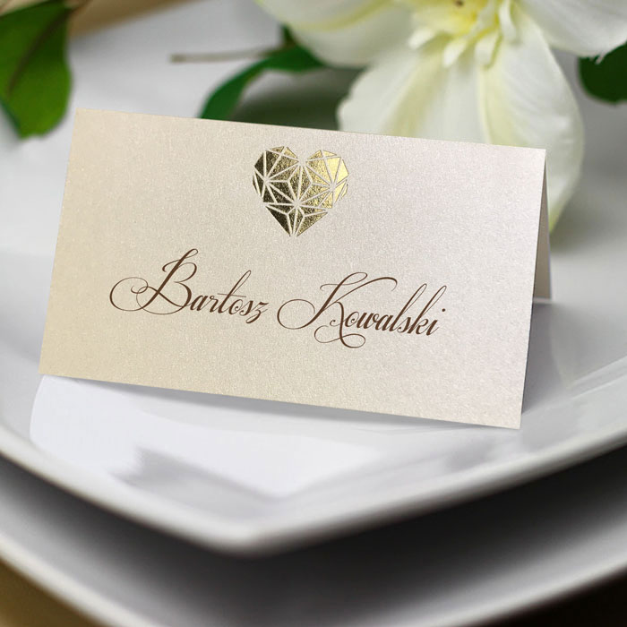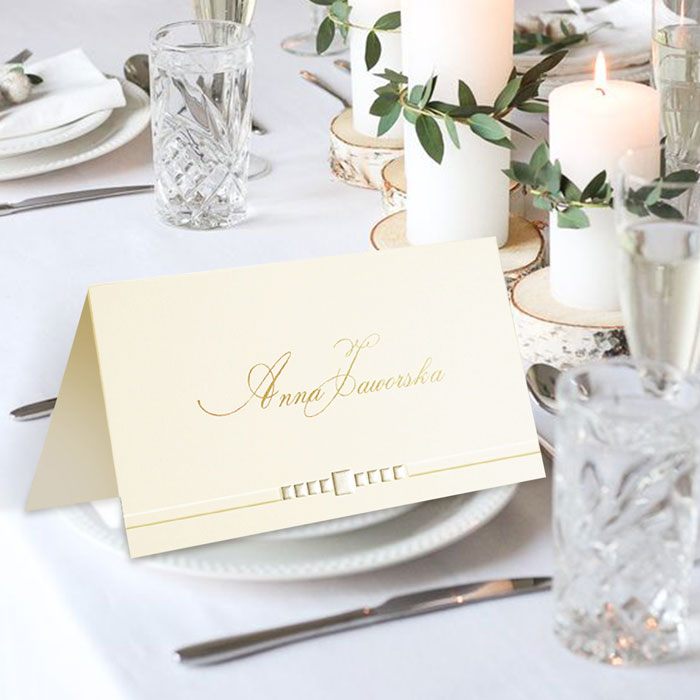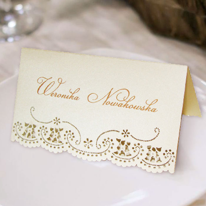 Winietka na stół z najnowszej kolekcji wykonana z perłowego papieru w kolorze ecru. Dół winietki wycięty w ozdobną falkę oraz wytłoczony motywem kwiatowym. Niektóre elementy zostały dodatkowo wyzłocone. Nadruk nazwisk bezpośrednio na winietce.
