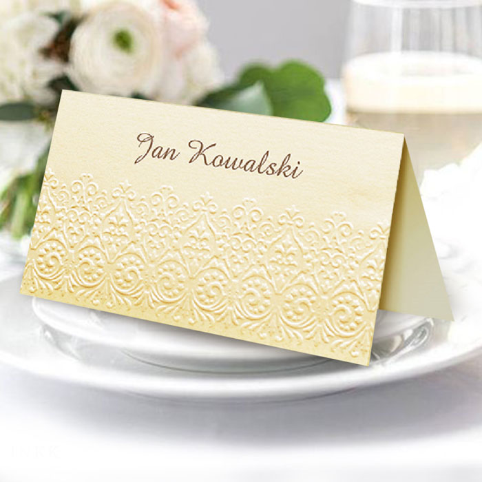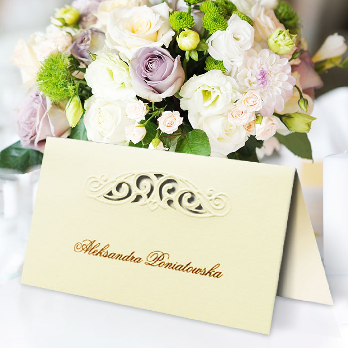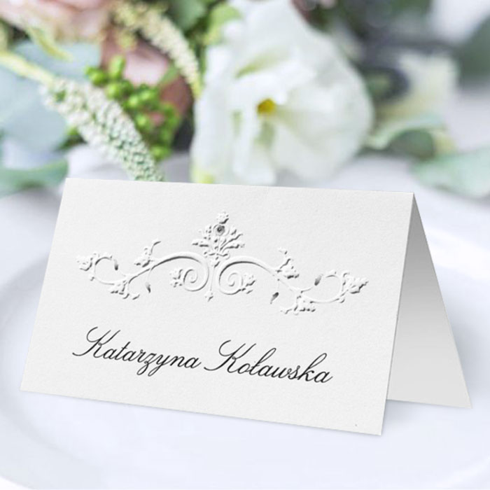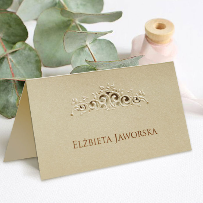 Winietka z najnowszej kolekcji wykonana z metalizowanego papieru w kolorze różowym z delikatnym zdobieniem w postaci serca wykonanego techniką hotstampingu. Nadruk nazwisk bezpośrednio na winietce. Precyzyjny nadruk, dokładność wykonania oraz wysokiej jakości papier.