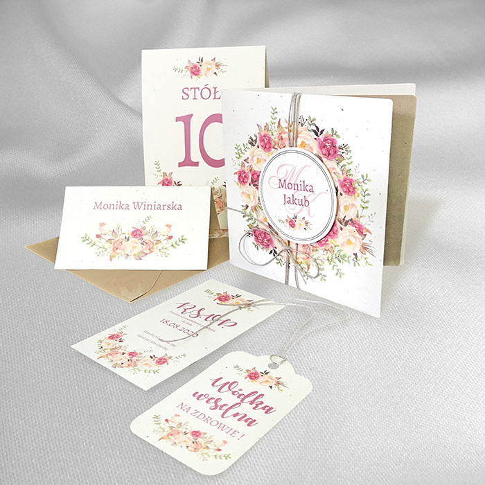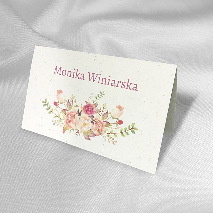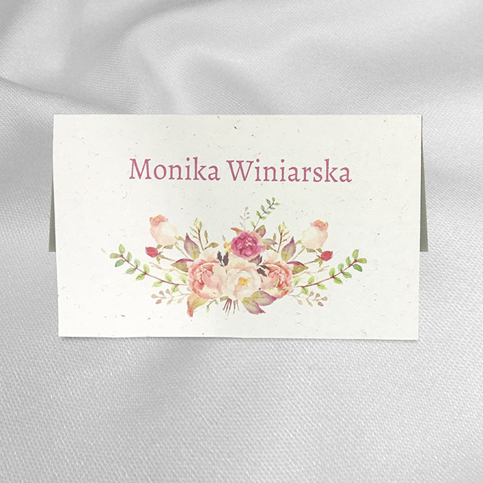 Winietka na stół wykonana z wysokiej jakości ozdobnego matowego papieru w kolorze ecru z widocznymi drobinkami. Na winietce znajdują się nadrukowany motyw kwiatowy. Nadruk nazwisk bezpośrednio na winietce. Precyzyjny nadruk, dokładność wykonania oraz wysokiej jakości papier.