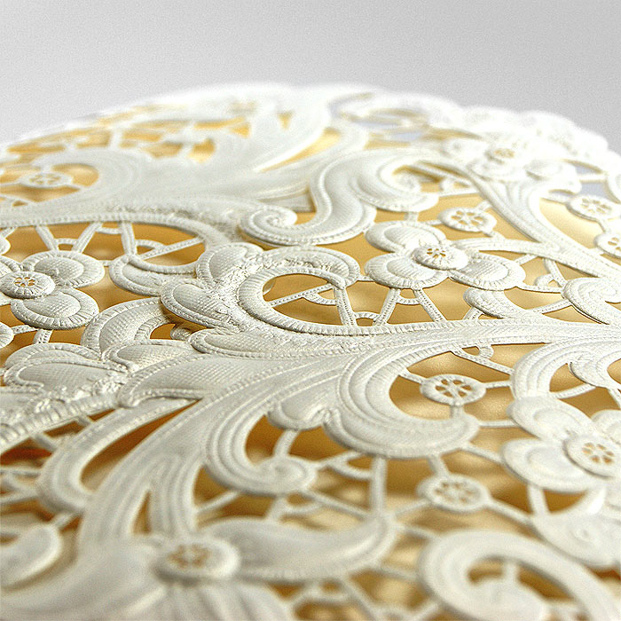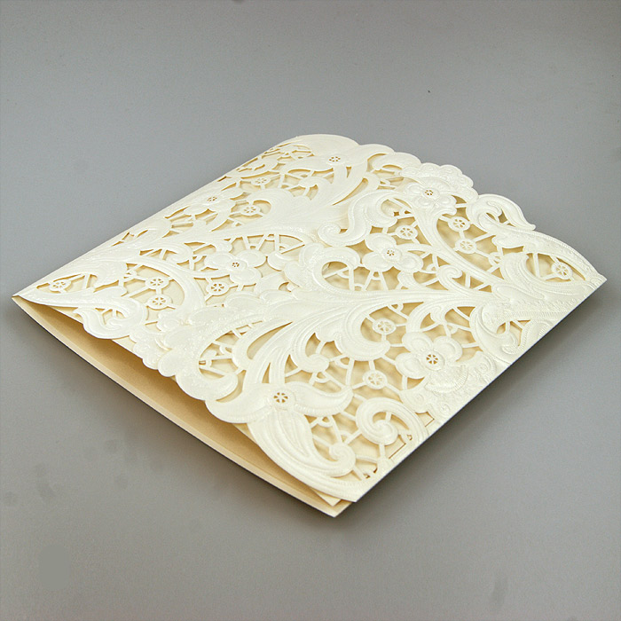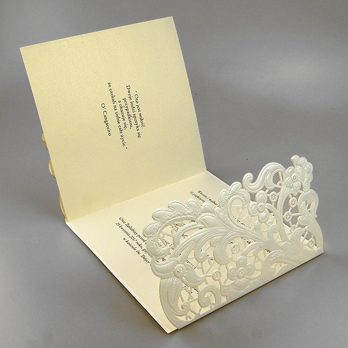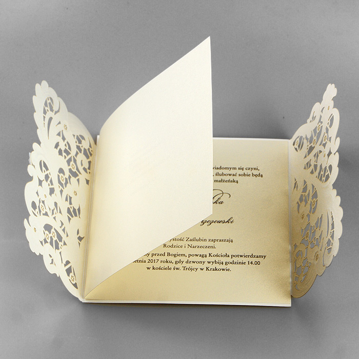Wyjątkowe zaproszenie z ozdobną okładką w formie bramki, z efektownym motywem wyciętym laserowo i wytłoczonym. Nadruk tekstu wykonywany jest na metalizowanej wkładce w kolorze ecru. Zaproszenie wysyłamy w formie gotowej do wręczenia. Zaproszenie wykonane z ogromną starannością i dbałością o detale. Precyzyjny nadruk, dokładność wykonania oraz wysokiej jakości papier.