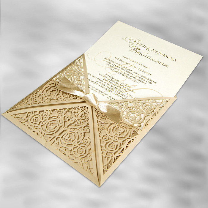 Eleganckie zaproszenie. Okładka w formie koszulki wykonana z matowego, białego papieru. Wycięcia na okładce przypominają koronkę. Zaproszenie ozdobione zostało srebrzeniami i perełkami. Nadruk tekstu wykonywany jest na jednostronnie złotej wkładce. Koperta w kolorze białym matowym.