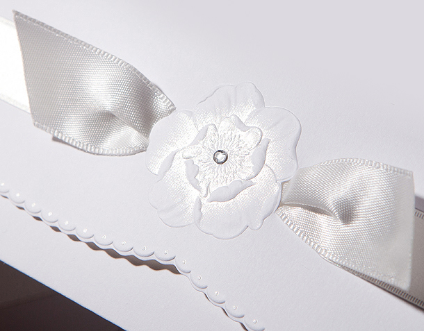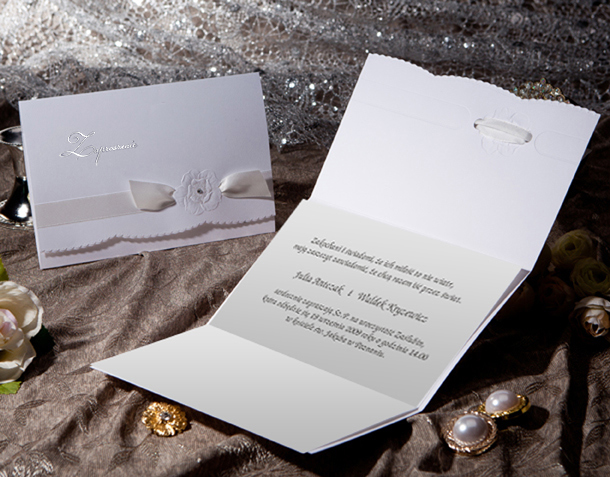 Eleganckie zaproszenie. Okładka wykonana z białego, matowego papieru. Przód okładki zakończony falką, której brzegi zostały dodatkowo wytłoczone. Nad falką widnieje wytłoczony kwiat przez który przechodzi biała, atłasowa wstążka. Dodatkową ozdobą jest szeroki wysrebrzony pasek przechodzący przez całą szerokość zaproszenia zastępujący wstążkę. Oraz delikatny krysztalik umieszczony pośrodku kwiata. W lewym górnym rogu znajduje się wysrebrzony napis „Zaproszenie”. Nadruk tekstu wykonywany jest na białej, matowej wkładce. Koperta w kolorze białym matowym.