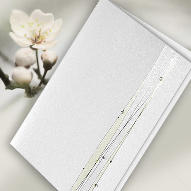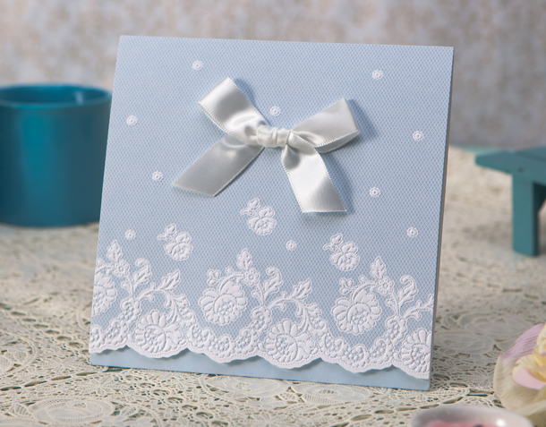 Eleganckie zaproszenie z najnowszej kolekcji. Okładka wykonana z białego, matowego papieru. Przód okładki cały wysrebrzony. Brzegi zaproszenia zostały wytłoczone w formie ramki, wewnątrz której nadrukowane są błękitne motywy kwiatowe. Pośrodku okładki widnieje wysrebrzony napis „Zaproszenie” a nad nim krysztalik. Nadruk tekstu wykonywany jest na białej, matowej wkładce. Koperta w kolorze białym matowym.