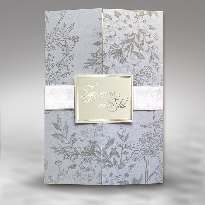 Eleganckie zaproszenie z najnowszej kolekcji. Okładka wykonana z białego, matowego papieru. Przód okładki cały wysrebrzony. Brzegi zaproszenia zostały wytłoczone w formie ramki, wewnątrz której nadrukowane są błękitne motywy kwiatowe. Pośrodku okładki widnieje wysrebrzony napis „Zaproszenie” a nad nim krysztalik. Nadruk tekstu wykonywany jest na białej, matowej wkładce. Koperta w kolorze białym matowym.