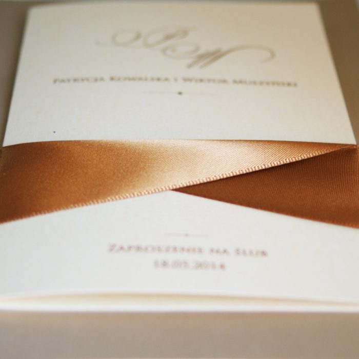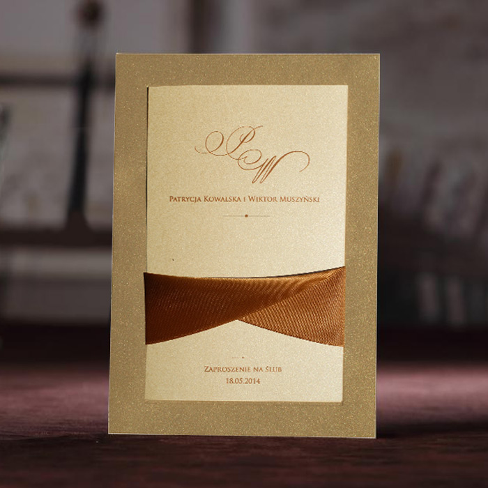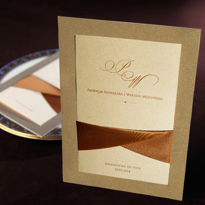 Okładka zaproszenia wykonana z metalizowanego papieru w kolorze złotym. Dodatkową ozdobą jest atłasowa brązowa wstążka przywiązana przez wycięcie w okładce. Wkładka do nadruku wykonana z perłowego papieru w kolorze ecru. Zaproszenie wysyłamy w formie gotowej do wręczenia. Zaproszenie wykonane z ogromną starannością i dbałością o detale.