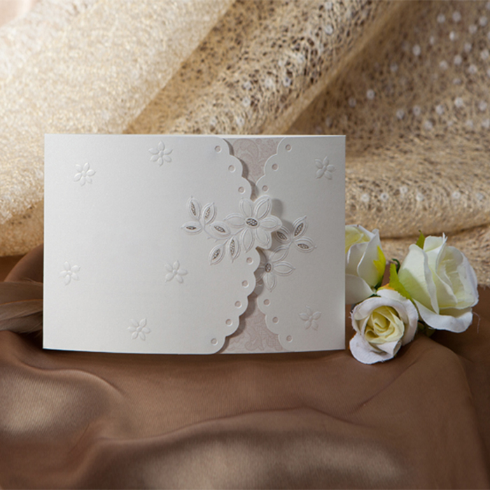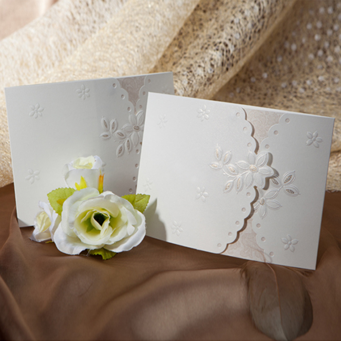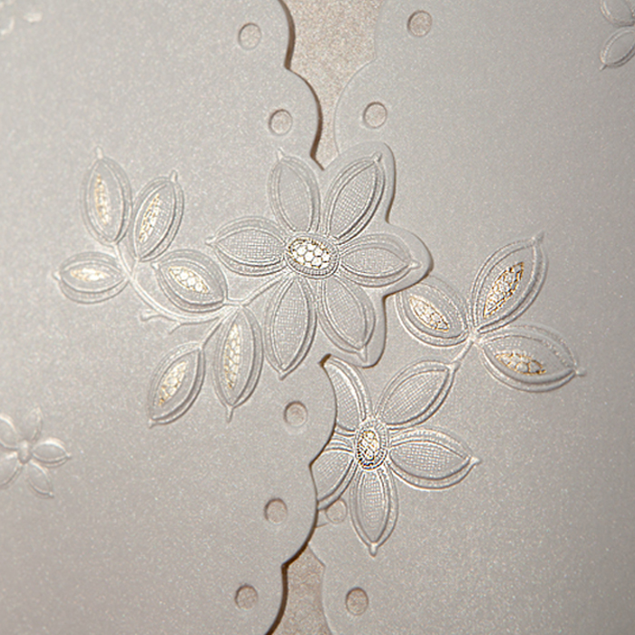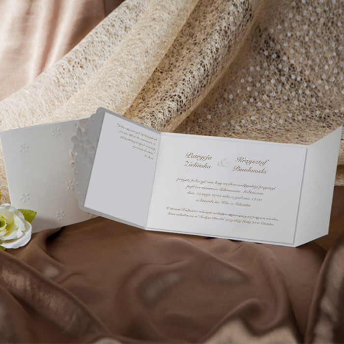 Eleganckie zaproszenie. Na okładce widnieje wykonany metodą tłoczenia oraz hot print kwiatowy ornament. Wkładka do nadruku wykonana z matowego papieru w kolorze ecru. Zaproszenie wysyłamy w formie gotowej do wręczenia. Zaproszenie wykonane z ogromną starannością i dbałością o detale.