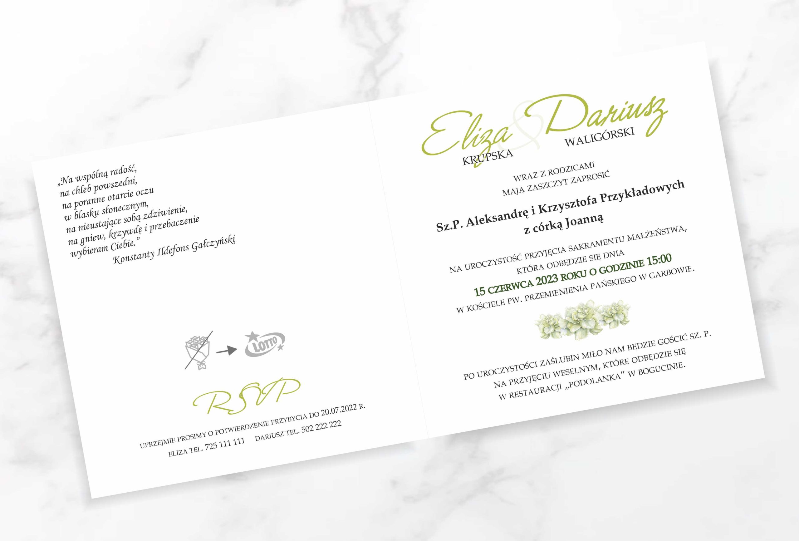 *na zaproszeniu został przedstawiony przykładowy wybór czcionek oraz ułożenia tekstów, a także rebusów – istnieje możliwość zmiany