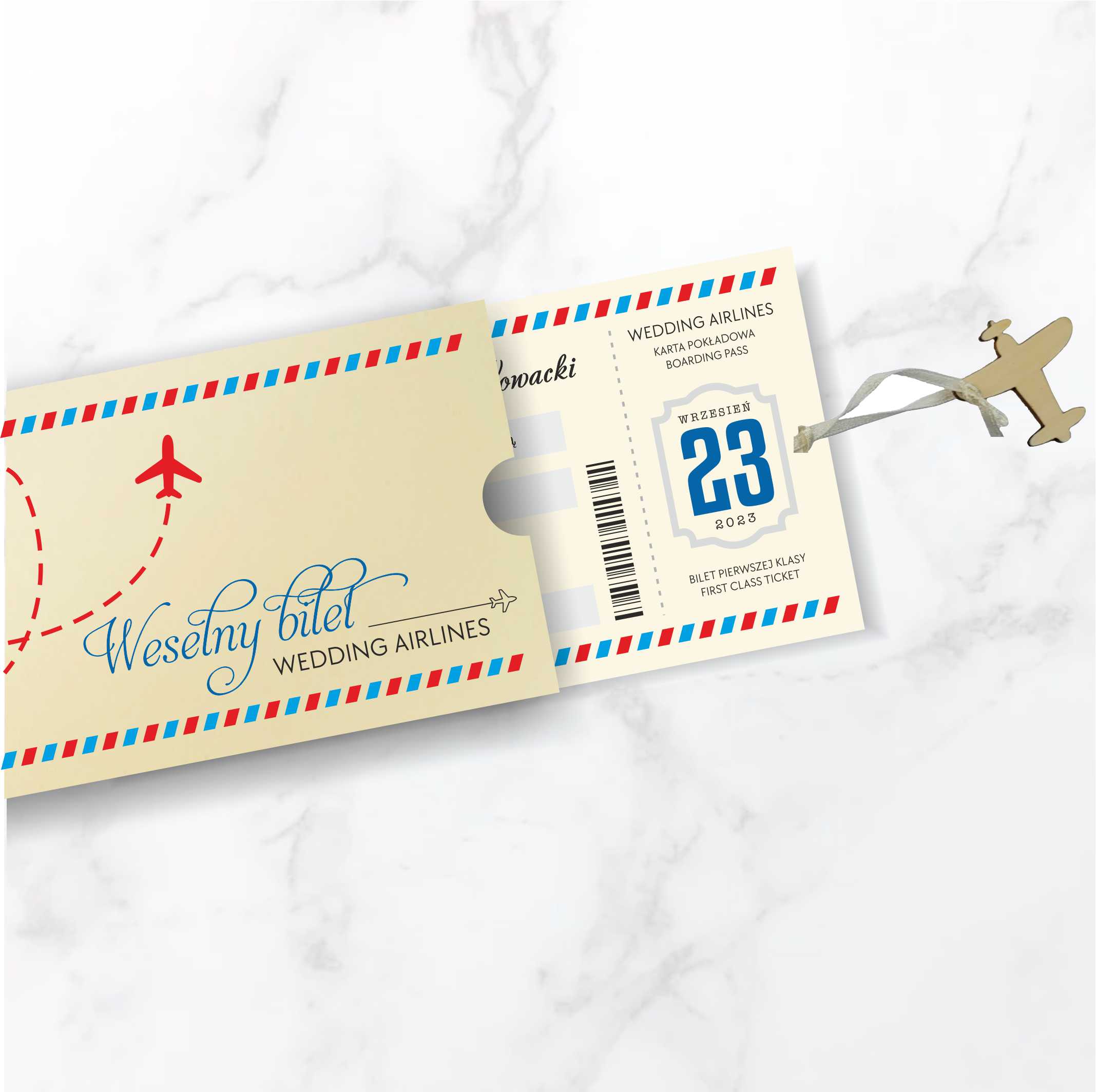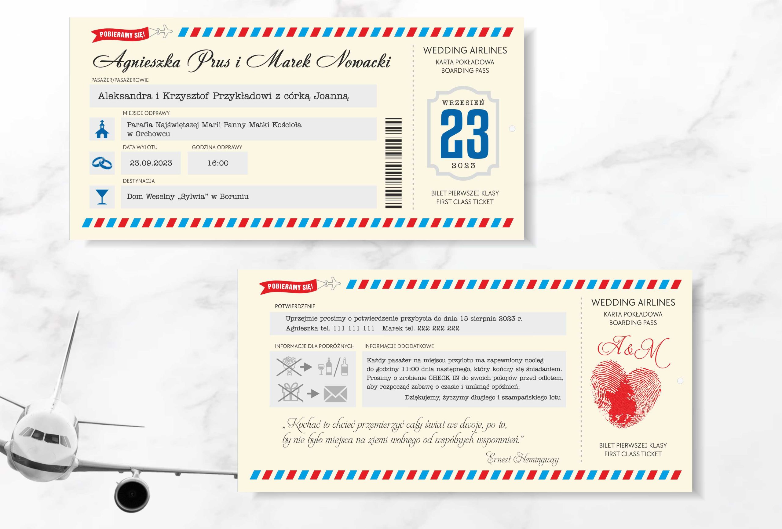 Zaproszenia ślubne zaprojektowane w formie biletu lotniczego. Jeżeli Wasze życie toczy się wokół takiego właśnie tematu lub poszukujecie ciekawego pomysłu na zaproszenie ślubne to jest to produkt dla Was!