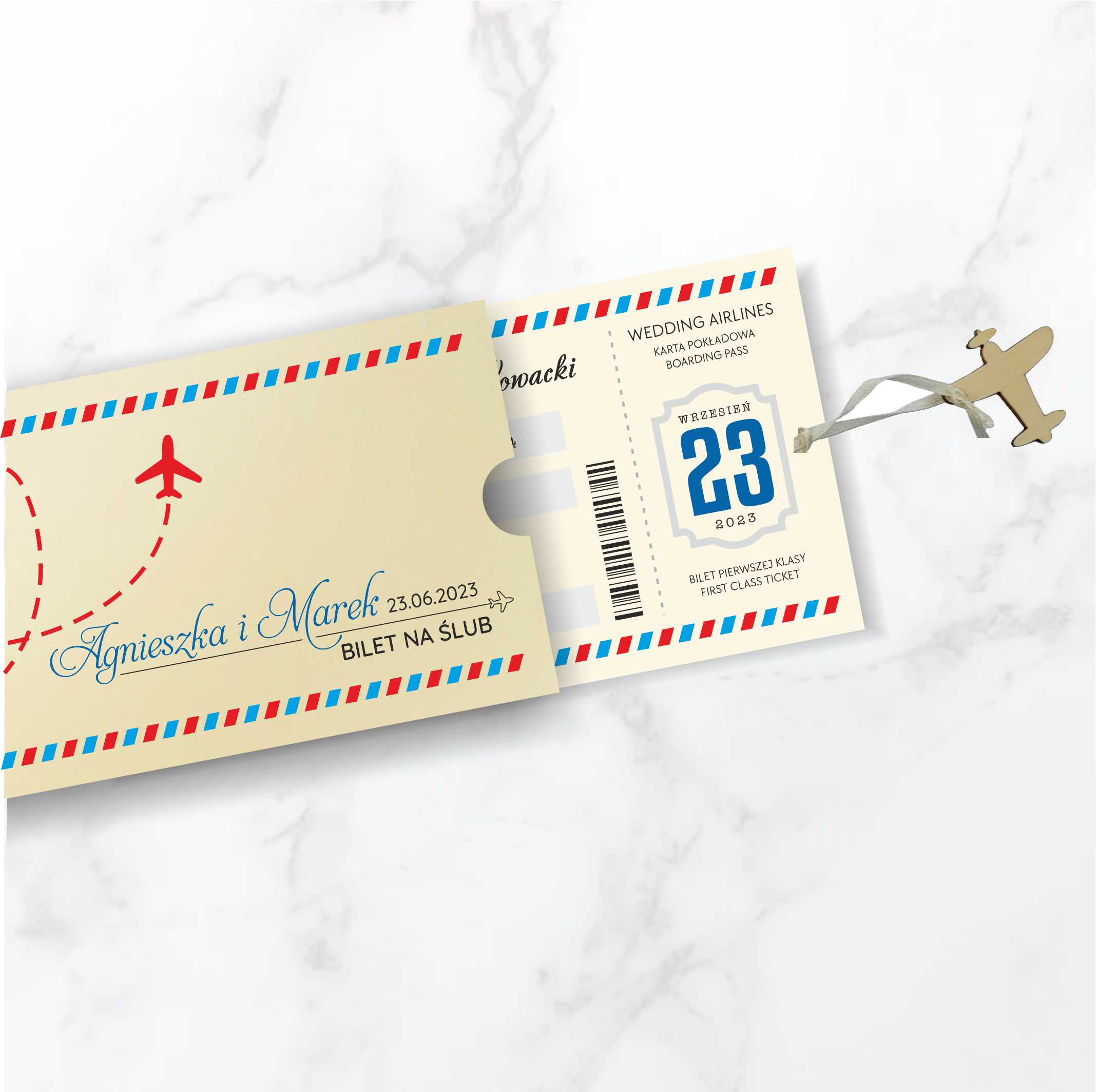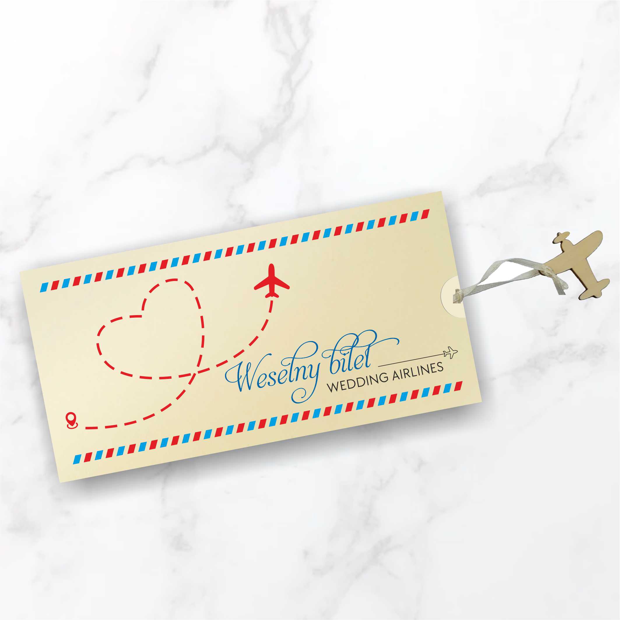 Stylistyka zaproszeń świetnie wkomponuje się w tematykę podróży jak i też odkrywania tajemniczych zakątków świata. Zaproszenia ślubne ręcznie robione z wielką starannością, wykonane z wysokiej jakości papierów. Nadruk tekstu na dwóch osobnych kartkach z matowego papieru w kolorze ecru, stylizowanych na bilet lotniczy, połączonych kremową tasiemką zakończoną drewnianą zawieszką w kształcie samolotu. Okładka z matowego papieru w kolorze ecru o gramaturze 250g, z możliwością nadruku imion i daty ślubu. Zaproszenie wysyłamy w formie gotowej do wręczenia. Zaproszenie wykonane z ogromną starannością i dbałością o detale. Precyzyjny nadruk, dokładność wykonania oraz wysokiej jakości papier. Minimalna ilość zamówienia – 25szt.