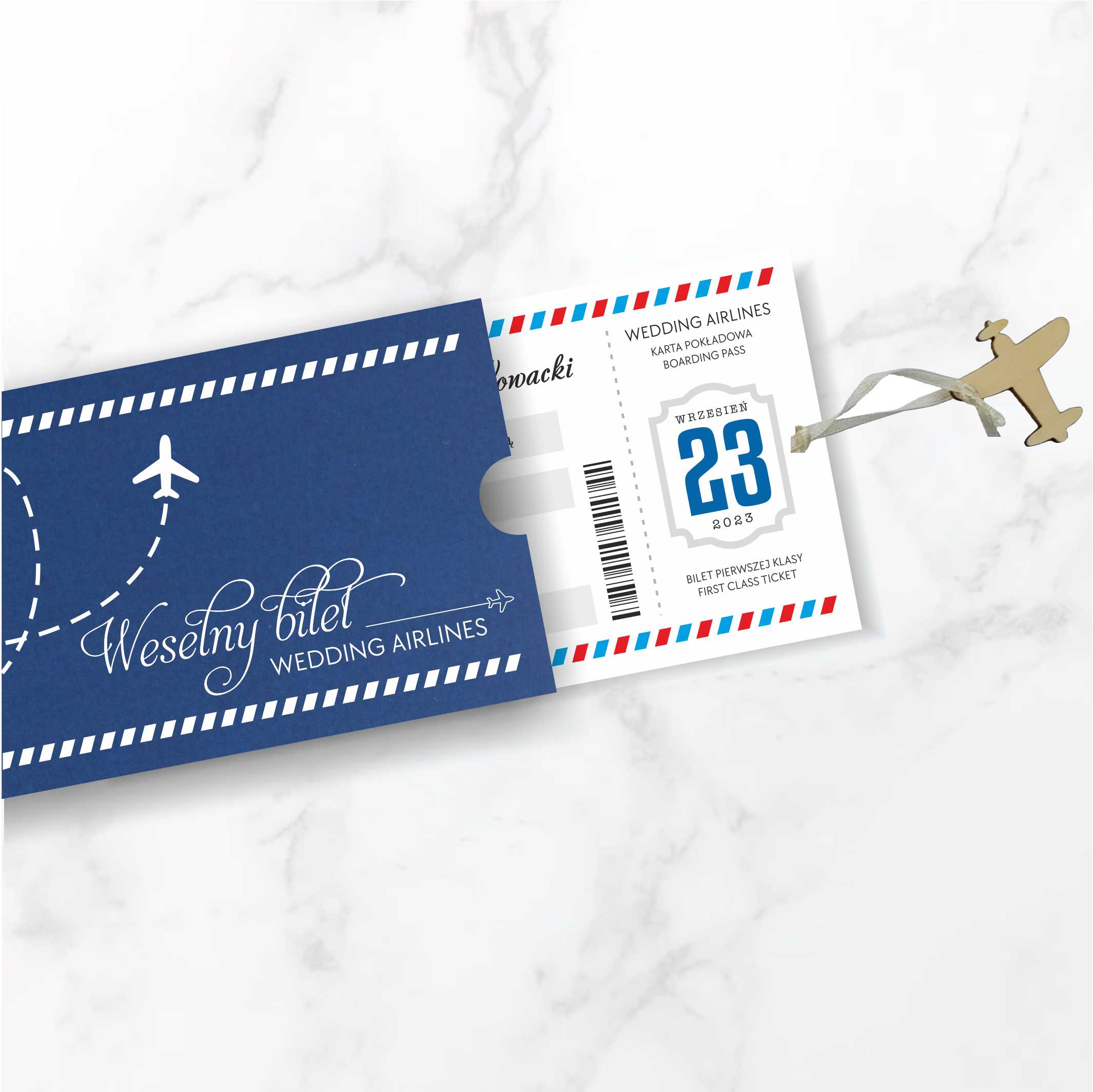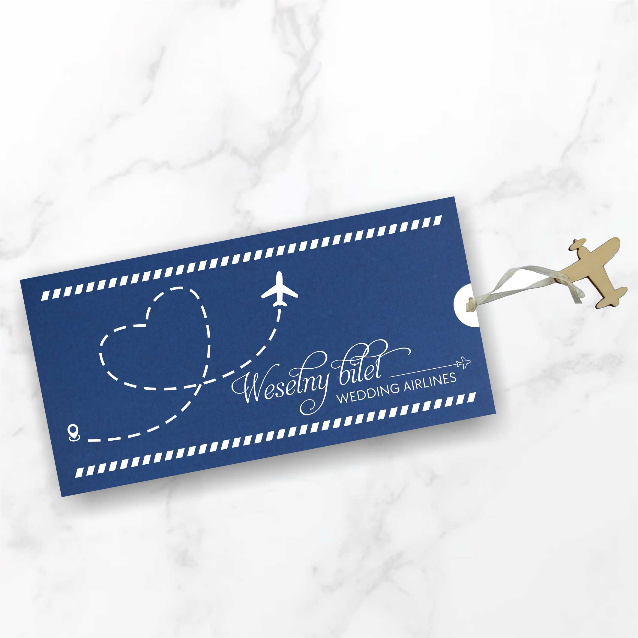 Stylistyka zaproszeń świetnie wkomponuje się w tematykę podróży jak i też odkrywania tajemniczych zakątków świata. Zaproszenia ślubne ręcznie robione z wielką starannością, wykonane z wysokiej jakości papierów. Nadruk tekstu na dwóch osobnych kartkach z matowego papieru w białym kolorze, stylizowanych na bilet lotniczy, połączonych kremową tasiemką zakończoną drewnianą zawieszką w kształcie samolotu. Okładka z matowego papieru w kolorze głębokiego granatu o gramaturze 250g, z możliwością nadruku imion i daty ślubu. Zaproszenie wysyłamy w formie gotowej do wręczenia. Zaproszenie wykonane z ogromną starannością i dbałością o detale. Precyzyjny nadruk, dokładność wykonania oraz wysokiej jakości papier. Minimalna ilość zamówienia – 25szt.