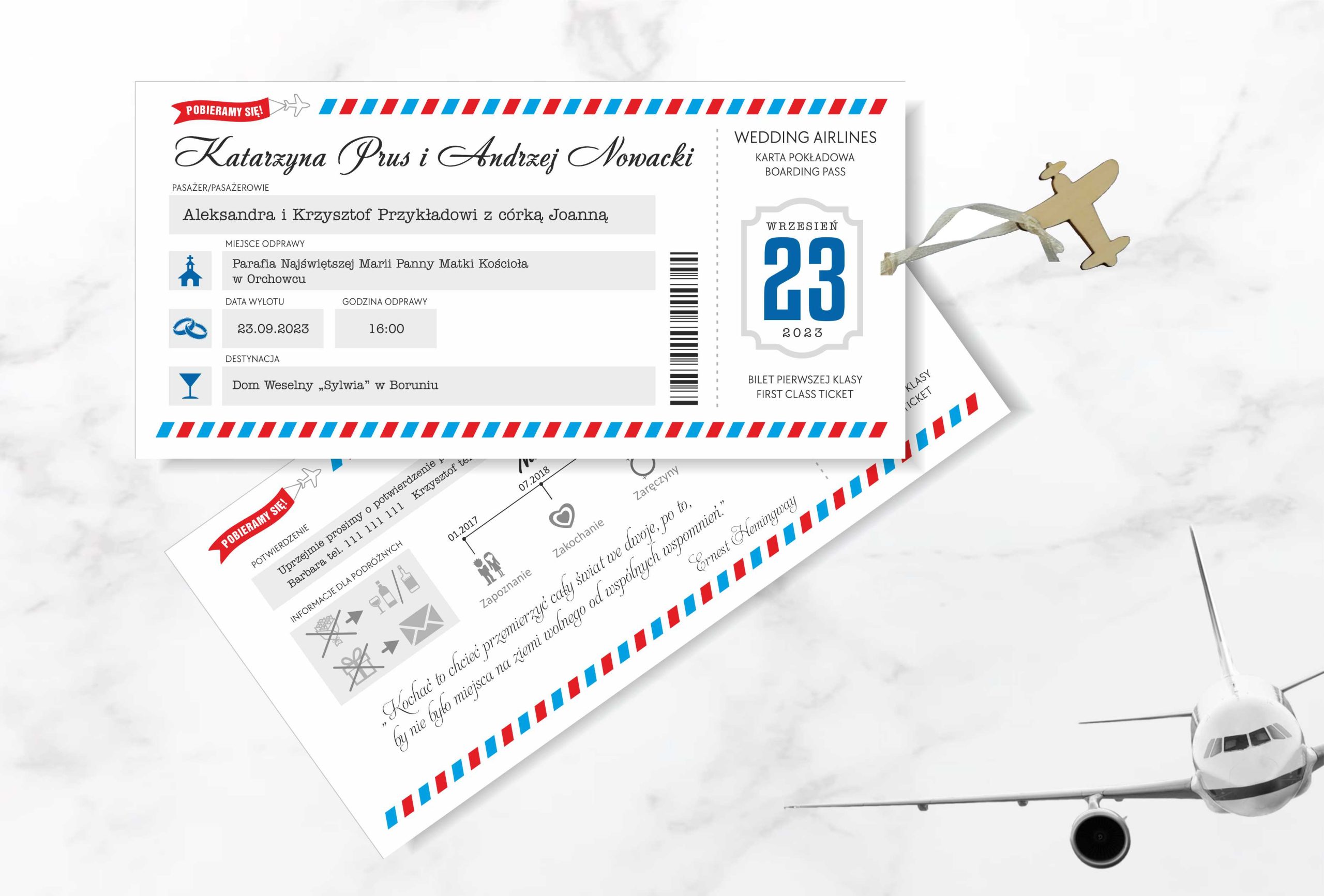 Zaproszenia ślubne zaprojektowane w formie biletu lotniczego. Jeżeli Wasze życie toczy się wokół takiego właśnie tematu lub poszukujecie ciekawego pomysłu na zaproszenie ślubne to jest to produkt dla Was!